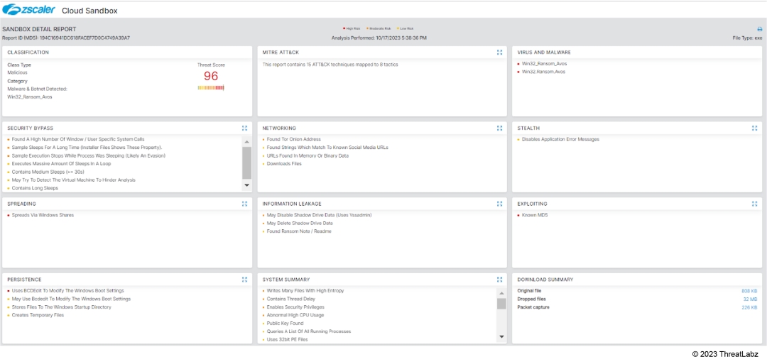 In addition to sandbox detections, Zscaler’s multilayered cloud security platform detects indicators related to AvosLocker at various levels with the threat names listed below.
