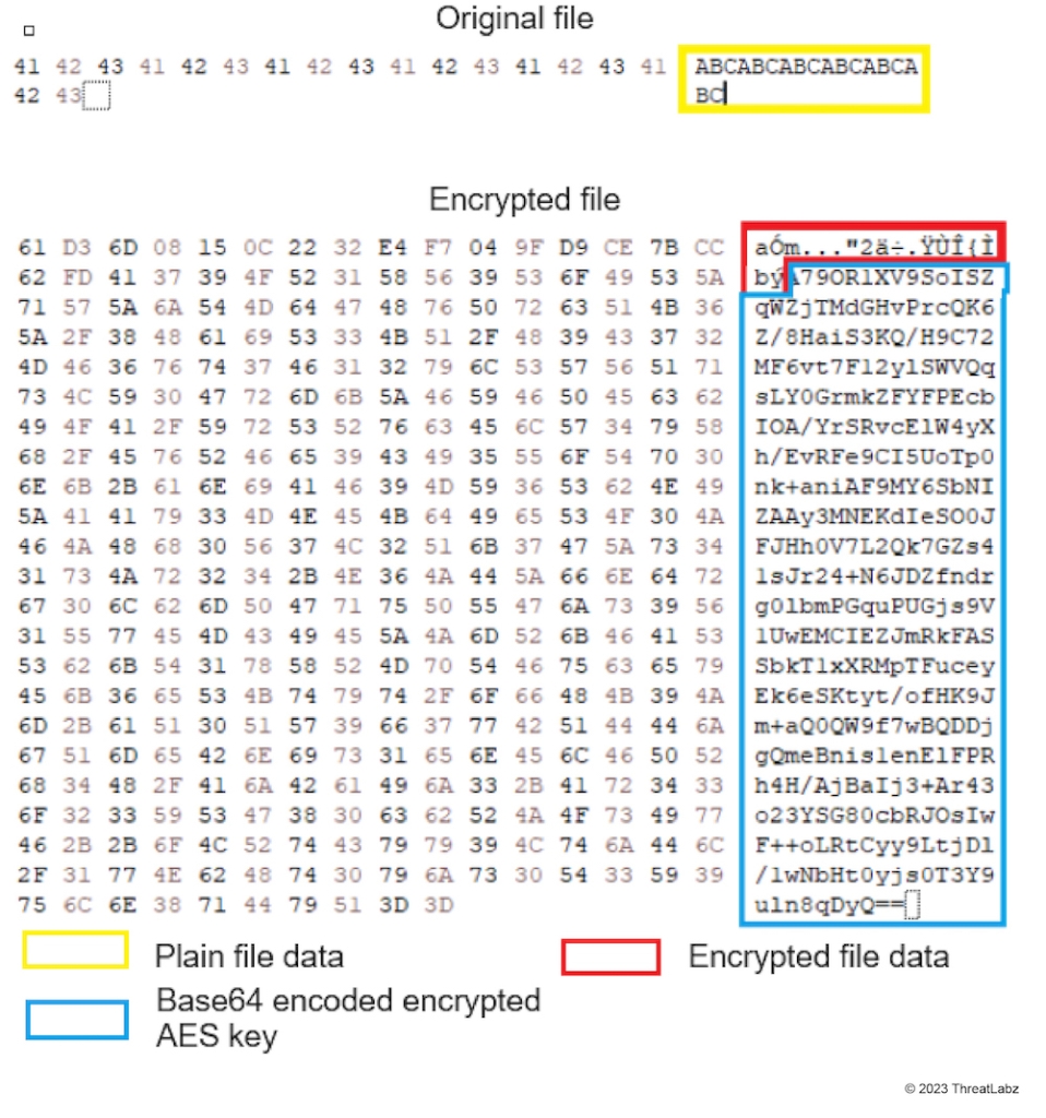 AvosLocker encrypts file content using AES in CBC mode with a randomly generated AES key. The AES symmetric key is then encrypted with a 2,048-bit RSA public key embedded in the ransomware binary. Finally, the RSA data containing the encrypted AES key is Base64 encoded and appended to the end of the encrypted file (see Figure 4). Then, the file extension is changed to .avos2.