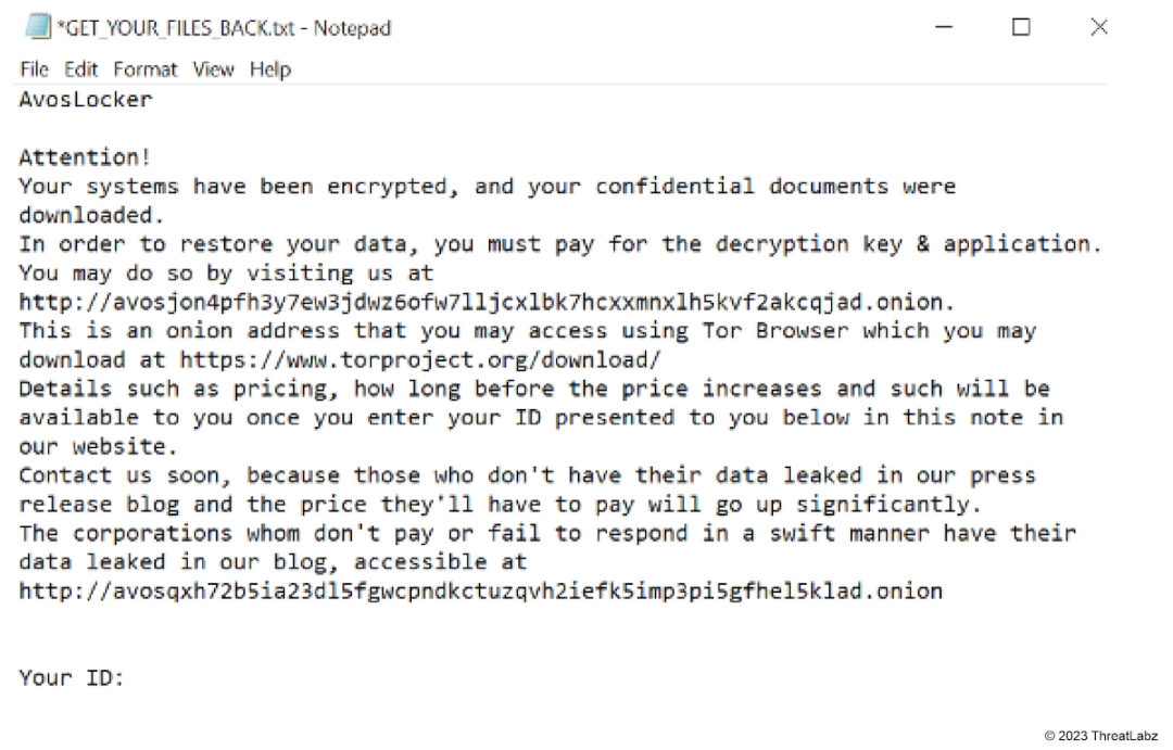 total time: clocks 20648 | 20.648000 secondsAfter encryption, AvosLocker drops a ransom note named GET_YOUR_FILES_BACK.txt as shown in Figure 5.
