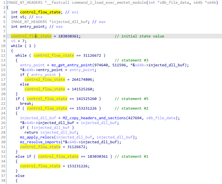 To make malware analysis and reverse engineering more difficult, Emotet uses a number of anti-analysis techniques. One of the first ones that stands out is control flow flattening where the structure of the program’s control flow is removed, making it difficult to trace its execution. Figure 1 shows an example function where a randomized “control_flow_state” variable is used along with various while loops, if-else, switch, and other statements to confuse the analysis: