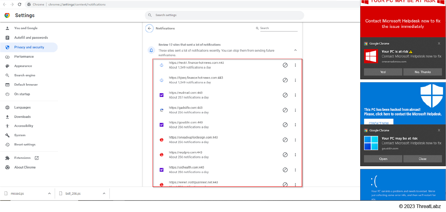 In the screenshot below, we see websites that were added to the allowed list. On the right side of the screen, the Windows notifications slider displays the scam notifications pushed by the websites.