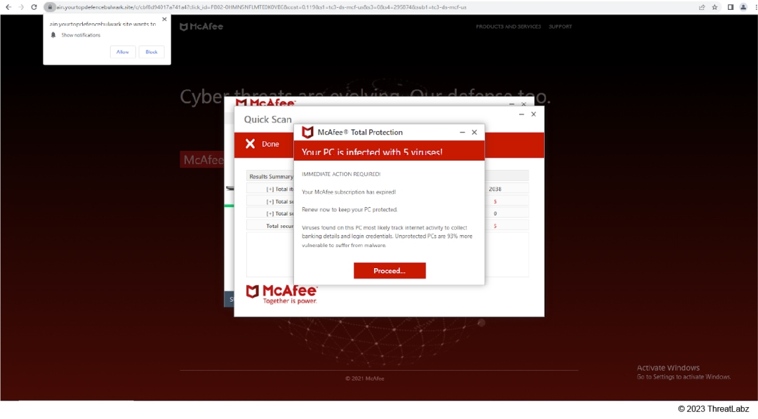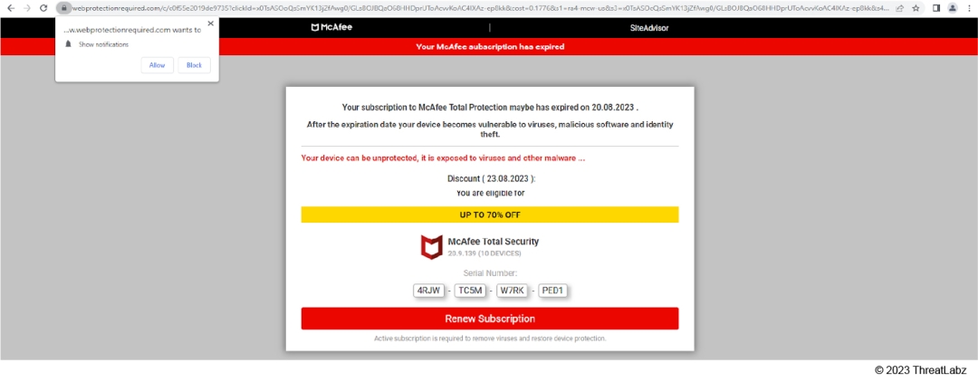 Once the user solves the captcha and clicks to allow access, the website uses the permission to display unwanted notifications and bombard the user with frequent pop-ups using the Windows Action Center. These pop-ups claim that the user's device is compromised and requires a renewal of their antivirus subscription. This is depicted in the images below.