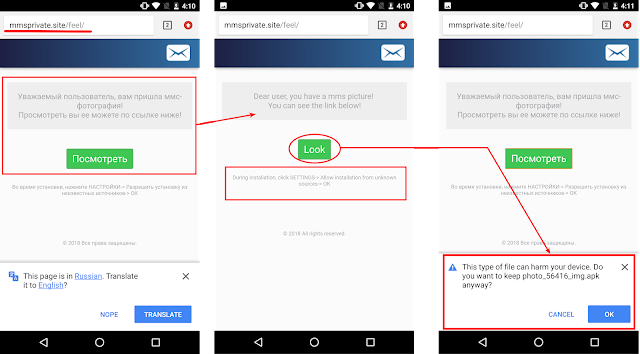 The malware is spreading through the site url:mmsprivate[.]site/feel/, and was most likely shared via SMS or email. As soon as the link is clicked, the spyware lures the victim to click a button that leads to the dropping of the malicious APK. The content hosted on the URL is in Russian. You can view the translation in the screenshot below: