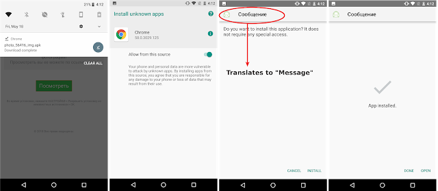 The APK is from an unknown source and, since Android systems do not allow direct-install, leads the victim via simple clicks to enabling the "Unknown Sources" option to install the malicious app. Each step is shown below starting from left to right.