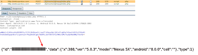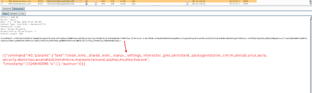 The above screenshot shows details of a victim's device being sent to a C&C. The C&C replied with command "40" and the names of apps. We noticed that command "40" was used for disabling the apps.
