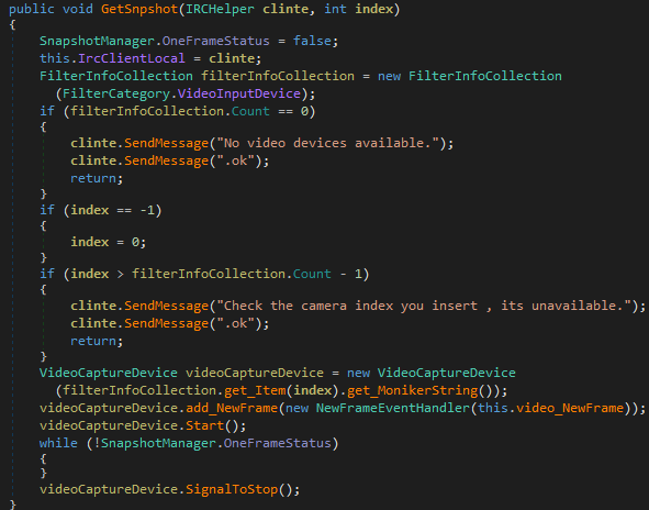Captures video frame, converts into Base64 and sends to C&C (Detailed information explained below); also replies “.oksnapshot”