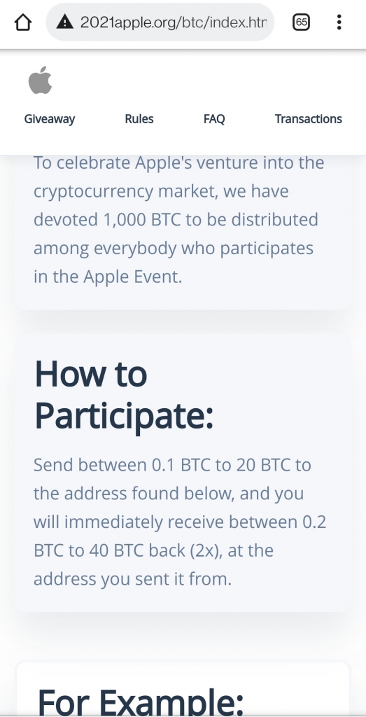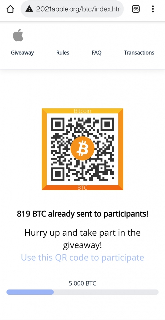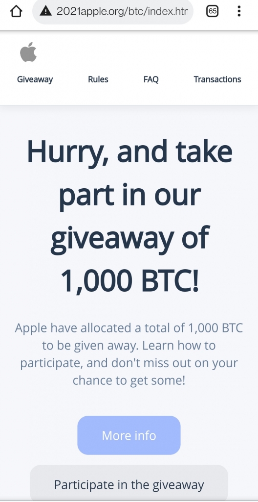 Once a user clicks on any of the buttons, it redirects to a page promoting Apple’s venture in CryptoCurrency and a giveaway of 1000 Bitcoins.
