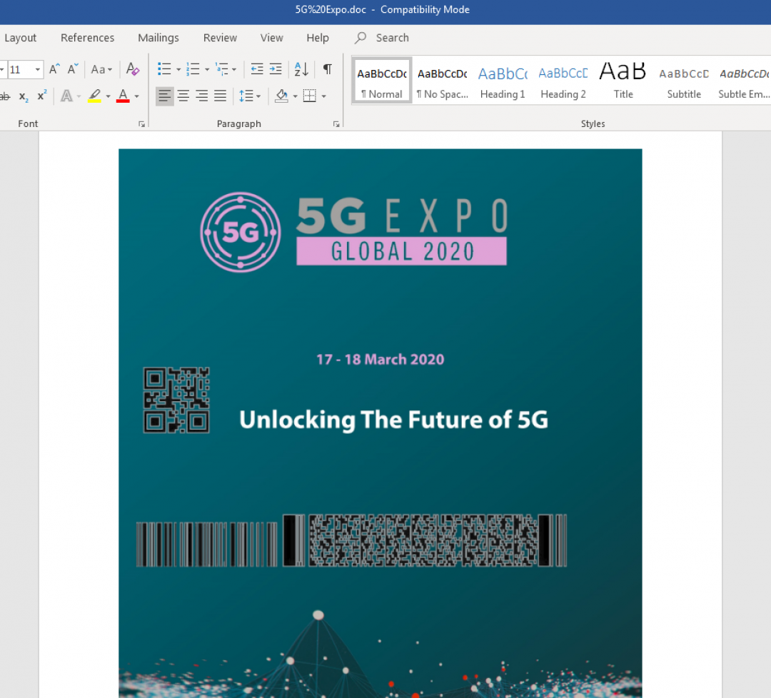 The first instance of the document related to this campaign was found on February 24, 2020. It was hosted at the URL: hxxps://documentsharing.space/files/5G%20Expo.doc?clientEmail=