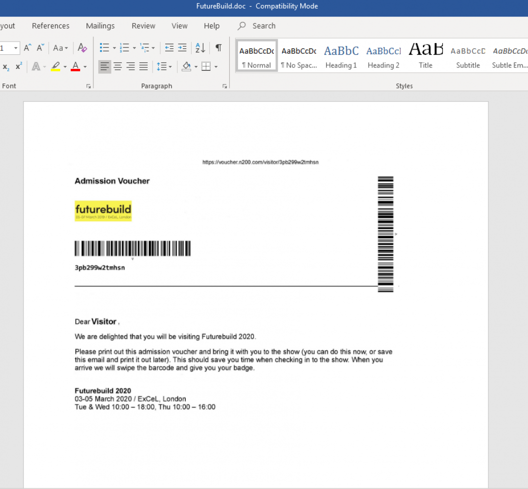 The content of this document was related to Futurebuild 2020 conference, which was supposed to take place between March 3-5, 2020 in London. The document spoofed the contents to look like an admission voucher for this conference as shown in Figure 2.