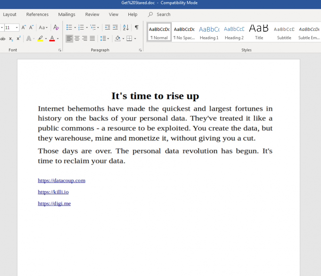 The content of this document was a message about a personal data revolution and included a list of legitimate sites as shown in Figure 3.