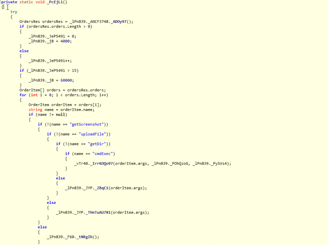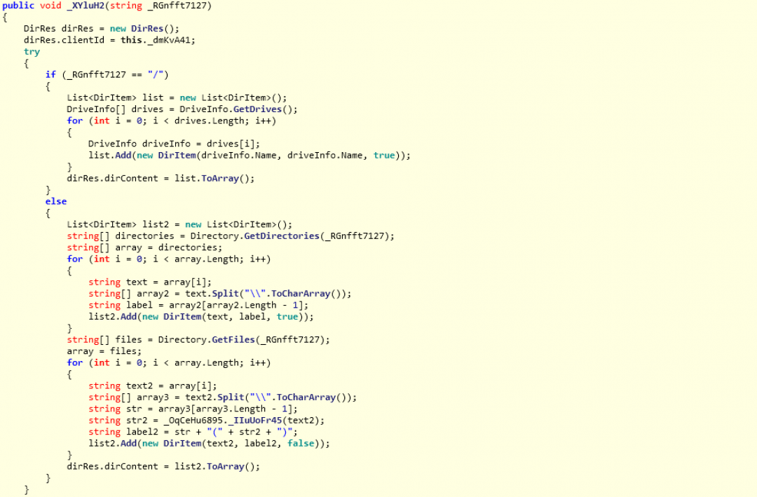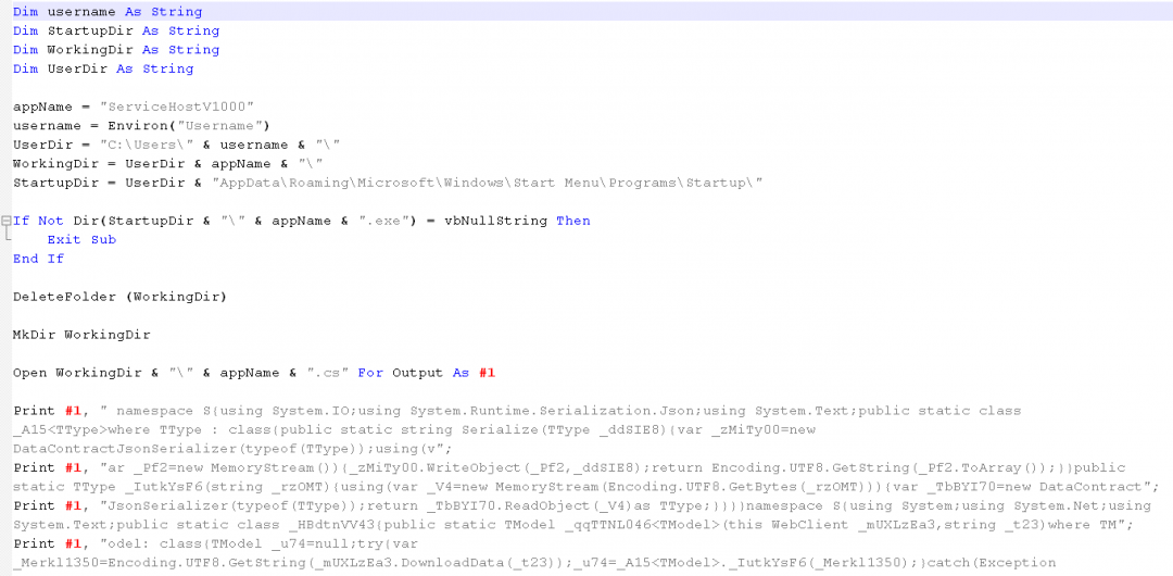 • It contains the complete C# code embedded inside the macro, which will be written at runtime to the file: ServiceHostV1000.cs in the working directory. The C# code is obfuscated at the source level. The obfuscation is simple. Only the variable, class and method names are obfuscated.