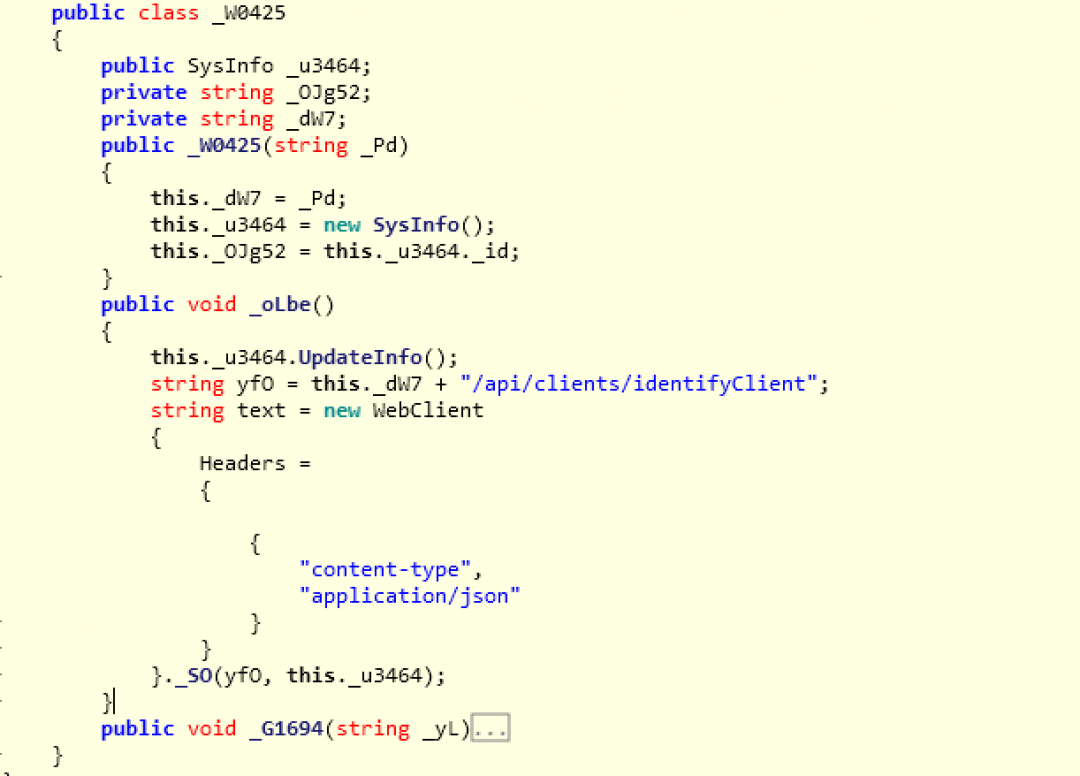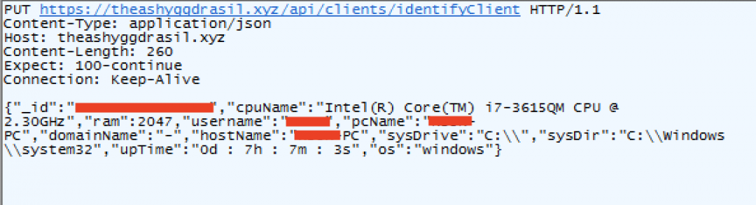The request is sent to the URL: hxxp://theashyggdrasil[.]xyz/api/clients/identifyClient and the Content-Type field is set to “application/json”. This first network request post-infection is used to register the bot with the attacker’s server with a unique identifier.
