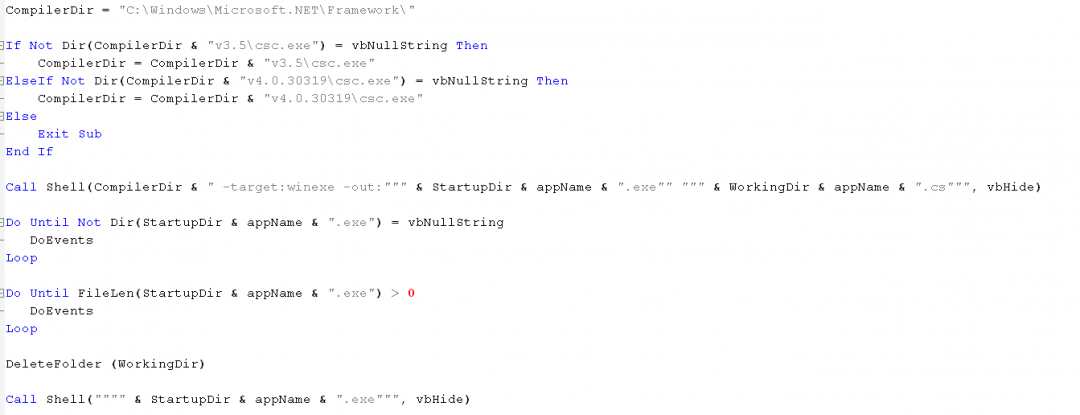 • It compiles the code using csc.exe and the command line parameter:”-target:winexe -out:”. The compiled binary will be present in the Startup directory.