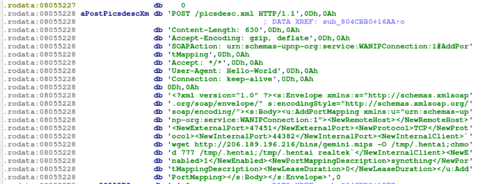 The payload dropped from the exploit was not packed, and a simple static analysis of the file showed reference to another famous UPnP SOAP exploit (CVE-2014-8361) in Realtek SDK Miniigd. This vulnerability affects all the IoT devices embedded with Realtek SDK. This Mirai variant tries to exploit all the other devices with the embedded exploit of Realtek SDK Miniigd.