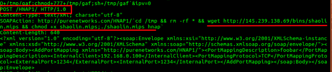 The payload also tries to exploit the Home Network Administration Protocol (HNAP) in D-Link routers to download additional payloads. The following snippet was fetched from a payload that shows usage of HNAP.