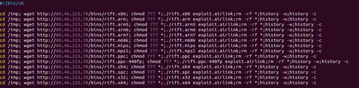 The “airlink.sh” (which is stored as “66trapgod”) downloads the final payload from the dropper server “89[.]46[.]223[.]70”. It downloads the payload for all the *INX and other firmware architectures and hopes one of its suits to victim’s architecture and executes it. All the payloads are prefixed with the “rift” string. The targeted architectures are: