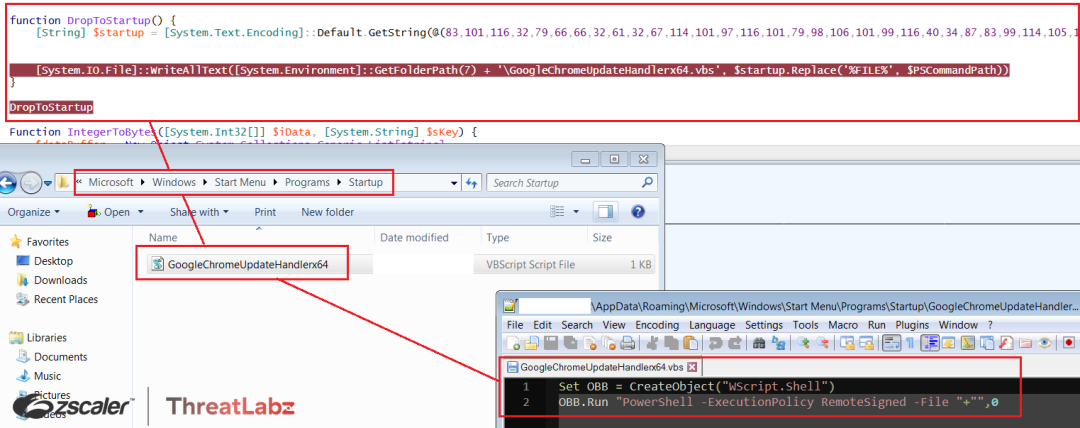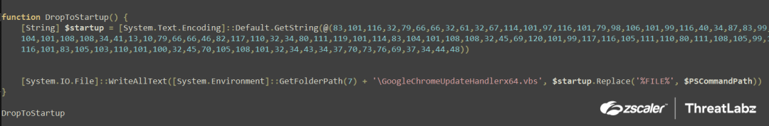 Upon running the "DroptoStartUp" function, a byte stream is converted via GetString() to a string and stored in the variable $startup. This string is then written to the Startup Folder using the WriteAllText() function and is named as "GoogleChromeUpdateHandlerx64.vbs". By doing this, the script is able to maintain persistence as files in the Startup Folder are executed by the system whenever the user logs on or starts Windows. The %FILE% argument is the $PSCommandPath environment variable which corresponds to the full path and file name of the script that invoked the current command.