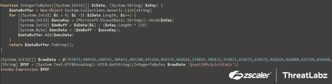 The script begins by initializing an encrypted integer stream called $rawData, which is passed on to a function called "IntegerToBytes()" along with the string argument $sKey "Qoepl10Msple1VCmle". Inside the function, a $dataBuffer is initialized to store the decrypted output, and a decryption loop is performed as follows below.
