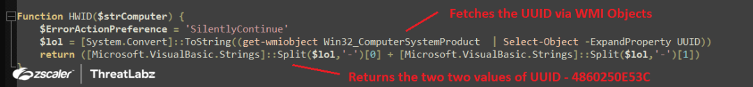 The "INF()" function is used to gather system information in the Stage-3 PowerShell script. Firstly, it retrieves the universally unique identifier (UUID) of the system by passing the computer name through the $env:computername environment variable to the "HWID()" function. The "HWID()" function executes a WMI Object query ("get-wmiobject Win32_ComputerSystemProduct | Select-Object -ExpandProperty UUID") to fetch the UUID and converts it into a string using the "ToString()" method. Next, the UUID is parsed to concatenate only the first two values while removing the "-" splitter from the identifier. Finally, the concatenated UUID is returned.