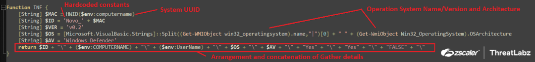 Additionally, in the Stage-3 Powershell script, the operating system's name, version, and architecture (32-bit or 64-bit) are collected using the following WMI object queries: Get-WMIObject Win32_OperatingSystem.Name (which splits the output string via “|”) and Get-WMIObject Win32_OperatingSystem.OSArchitecture. The script also collects the computer name and username of the system. Once all of the necessary information is collected, it is arranged and concatenated with specific constant strings in a particular order, as displayed in the screenshot below.