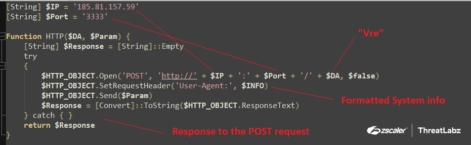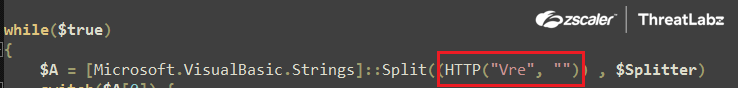 Next, the script calls the HTTP() function to download the Stage-4 Powershell script from the Download Server. The HTTP() function takes two arguments: the first is set to “Vre” and the second is null, as shown in the screenshot below.