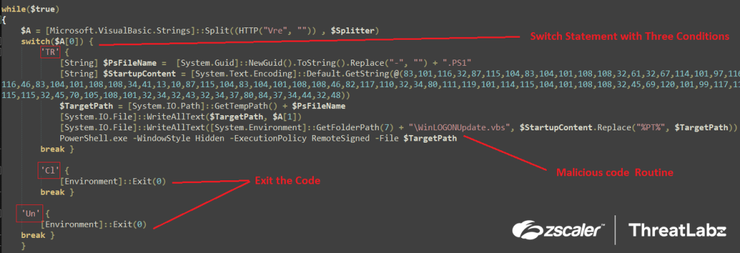 The split function then separates the script in two parts. One is “TR”, which is the command from the downloader server, and second is the Stage-4 Powershell script. The first part, i.e., index “0”, the command from the downloader server, is then passed on to the switch statement which consists of three conditions as shown in the screenshot below.