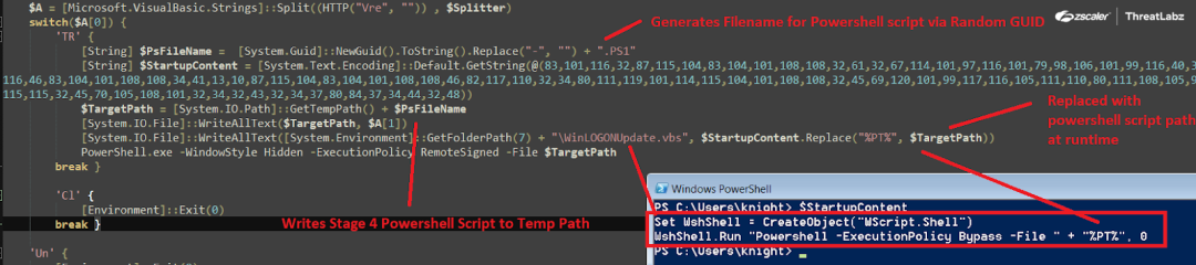 Further, in order to maintain persistence, the same technique used in the previous “DropToStartUp()” function is implemented where the byte stream is converted to string and then written in the startup folder with the file named as WinLogonUpdate.vbs in this case. Therefore whenever the system is restarted, the Stage-4 Powershell script is executed automatically by the system using the WinLogonUpdate.vbs script by initially creating an Wscript.Shell Object. Then the Stage-4 Powershell Script, as the Temp File path of the Powershell script, is updated at runtime while dropping the script as shown in the screenshot below.