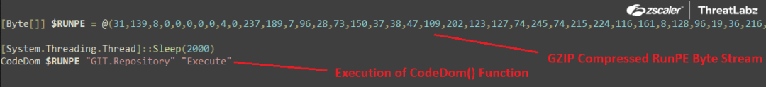 Further, the most important function of the Snip3 Crypter, the CodeDom(), is executed. The CodeDom function takes three arguments. The first one is the GZIP compress RUNPE code in byte format, the second is the type object, “Git.Repository”, where Git is the namespace and Repository is the class name, and the third, “Execute”, is the method to be invoked after sleeping for 2000 milliseconds as shown in the screenshot below.