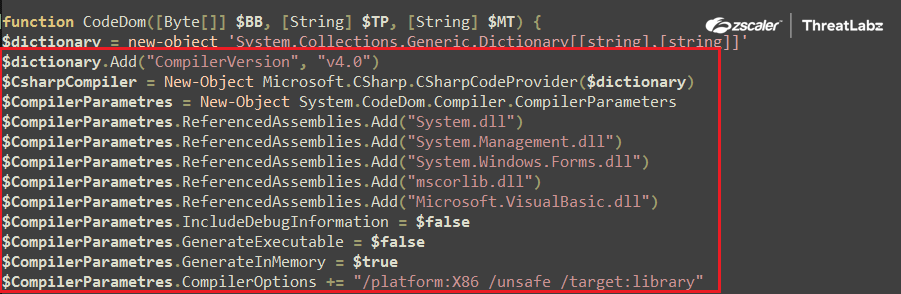 Upon being executed, the CodeDom function initializes the CodeDom compiler. a .NET API which allows devs to programmatically compile code using the .NET compilers where the version is set to v4 in this case. Along with the version, the compiler parameters such as CompilerOptions and IncludeDebugInformation are initiated during the compilation process shown in the screenshot below