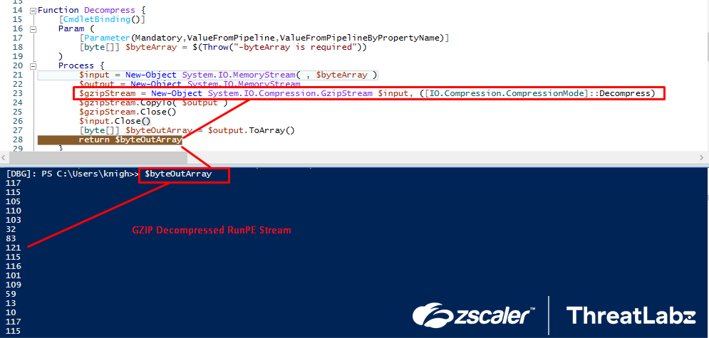 Post-initialization of the CodeDom Compiler the GZIP compressed RunPE byte stream is decompressed via the Decompress($RunPE) function. This uses the System.IO.Compression.GzipStream with the “Decompress” parameters with input as the GZIP compressed RunPE byte stream, as shown below.