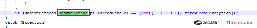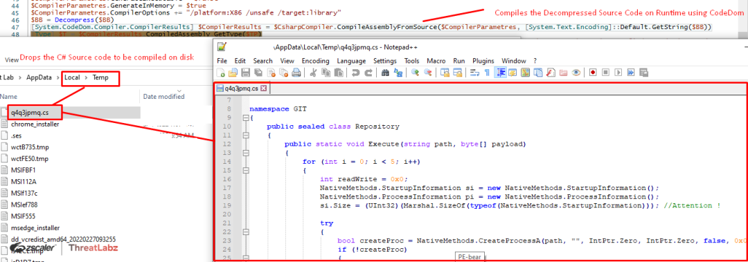 Once the RunPE Byte Stream is decompressed, it’s then compiled dynamically at runtime using CompileAssemblyFromSource via the CodeDom API, where the argument to the functions is the Decompressed RunPE Byte stream. During the compilation, the CSC.exe, i.e., the C# command line compiler process, is spawned, and the compiler creates a temporary CS source code file in the temp directory. After analyzing the dropped source code file, the ThreatLabz team was able to formulate that “RunPE” technique is been used in order to inject the final RAT payload into remote process via process hollowing, as shown in the following screenshot.