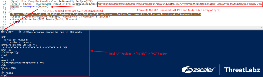 Further, the decoding routine of the final RAT payload takes place where fthe URL encoded payload was decoded to a byte array using the UrlDecodeToBytes() function. Then, the output is passed on to the Decompress() function where the URL-decoded byte array is GZIP decompressed. The GZIP decompressed file is the final executable RAT file with the “MZ” header, as shown in the following screenshot.