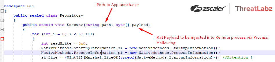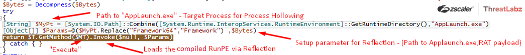 Once the RunPE source has been dynamically compiled and the RAT payload has been decoded, the Snip3 Crypter reflectively loads the compiled RunPE loader in-memory via an Invoke() function where the executed method is “execute” and the arguments are the path to AppLaunch.exe gathered via GetRuntimeDirectory().