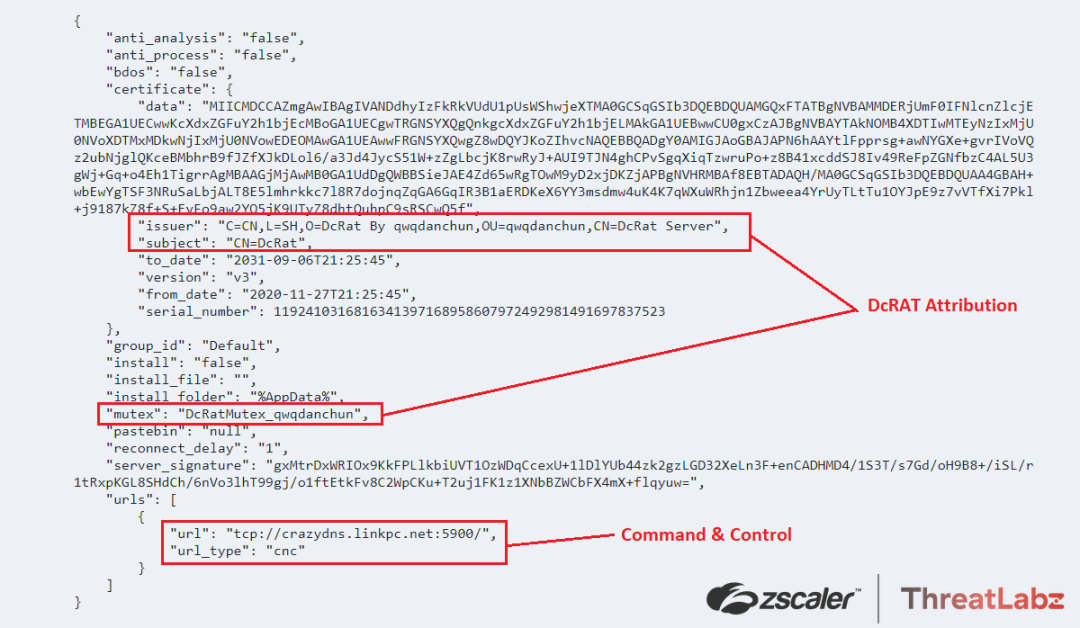 Further, the ThreatLabz team dumped the RAT payload from the remote process “AppLaunch.exe” then extracted the configuration as shown in the following screenshot. By analyzing the configuration, they were able to attribute the malware as “DcRat” as per the mutex value: DcRatMutex_qwqdanchun and the certificate information: DcRAT Server as seen in the extracted configuration.