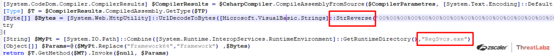 The ThreatLabz team analyzed multiple different Snip3 Crypter’s delivering DcRAT where the loader was almost similar and found that the changes were made only in the case of the target process selected for hollowing such as “RegSvcs.exe”/“InstallUtil.exe”/”RegAsm.exe”. In some cases, the RAT decoding routine consists of the StrReverse() function along with the URL UrlDecodeToBytes() function, which would first reverse the URL-encoded string and then URl decode it in order to deliver the final DcRAT payload.