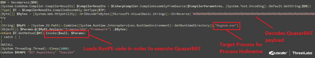 Post this the QuasarRAT payload is injected into the “RegAsm.exe” using the Dynamically compiled RunPE code which internally uses Process Hollowing as a Process Injection mechanism.