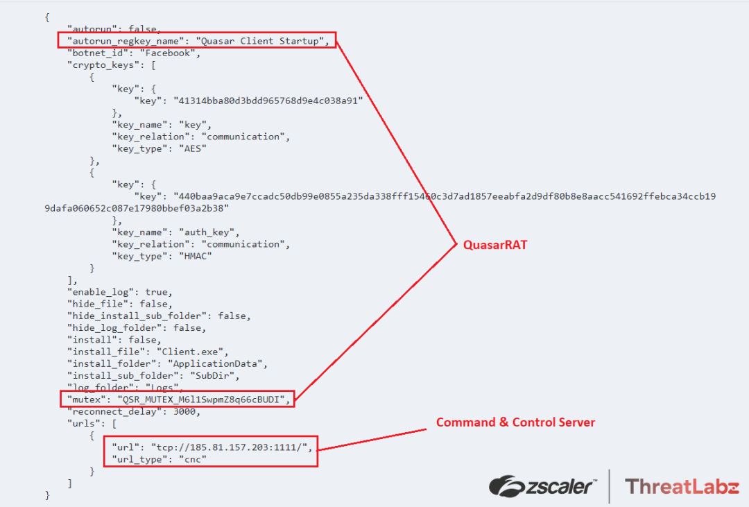 Further, the ThreatLabz team dumped the RAT payload from “RegAsm.exe” and extracted the configuration which helped them in the Attribution by analyzing the Mutex value: “QSR_MUTEX_M611SwpmZ8q66BUDI” and the autorun_regkey_name: “Quasar Client Startup” leading to the conclusion that the Snip3 Crypter was being leveraged in order to deliver QuasarRAT on the targeted machines.