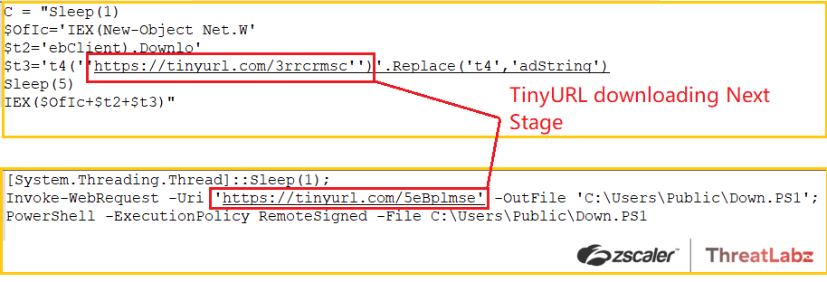 - URLs are shortened using TinyURL to download the Stage-2 and Stage-3 PS script