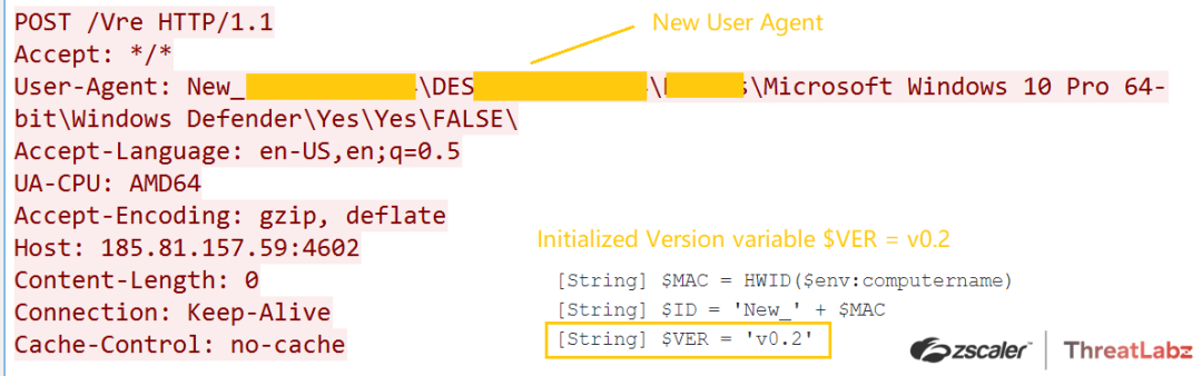 - User-agent changes are used to download the final stage and addition of version variable ($VER = 'v0.2') in the Stage-3 PS Script