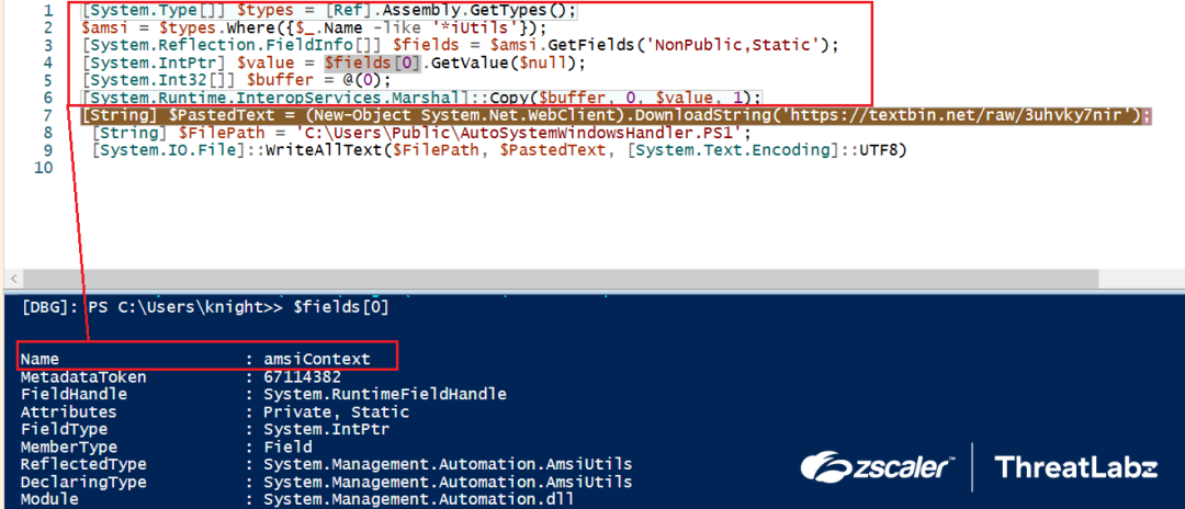 - An AMSI bypass was discovered in the initial PowerShell script, decoded via the VBScript. This bypass involved setting the AmsiContext to "0," which causes AmsiScanBuffer/AmsiScanString to return E_INVALIDARG, effectively bypassing AMSI. ThreatLabz also came across an AMSI bypass implemented in the Initial PS Script (decoded via the VBScript). Here, the AmsiContext is set to “0” which makes the AmsiScanBuffer/AmsiScanString to return E_INVALIDARG, which in turn bypasses the AMSI.