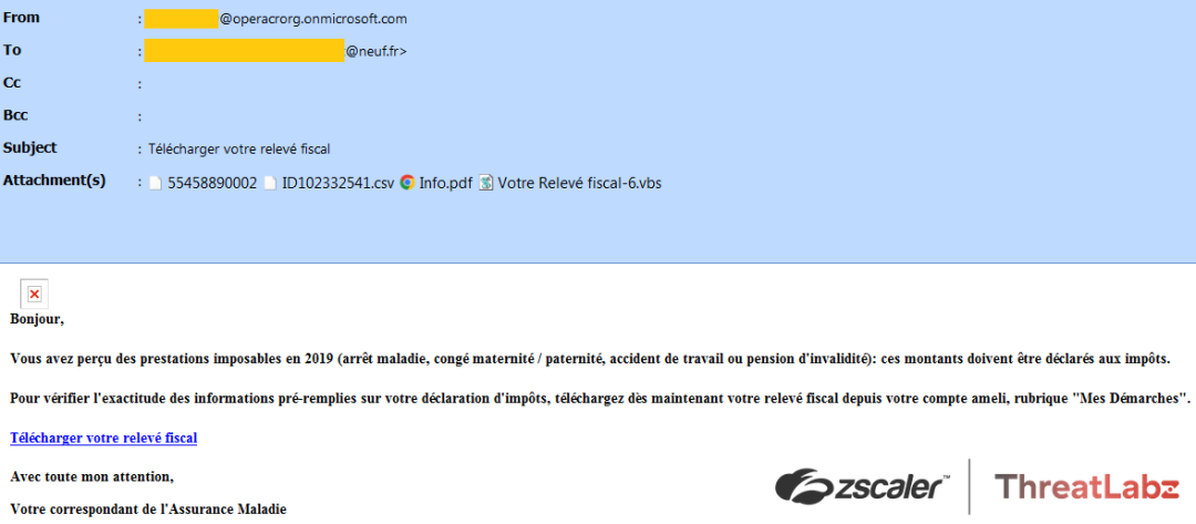 The attack is initiated through a spear phishing email that has the subject line "Download your tax statement" or, in French, "Télécharger votre relevé fiscal." The emails are designed to create a sense of urgency and importance, thereby enticing users to open the attached files without much consideration. This marks the start of the infection chain.