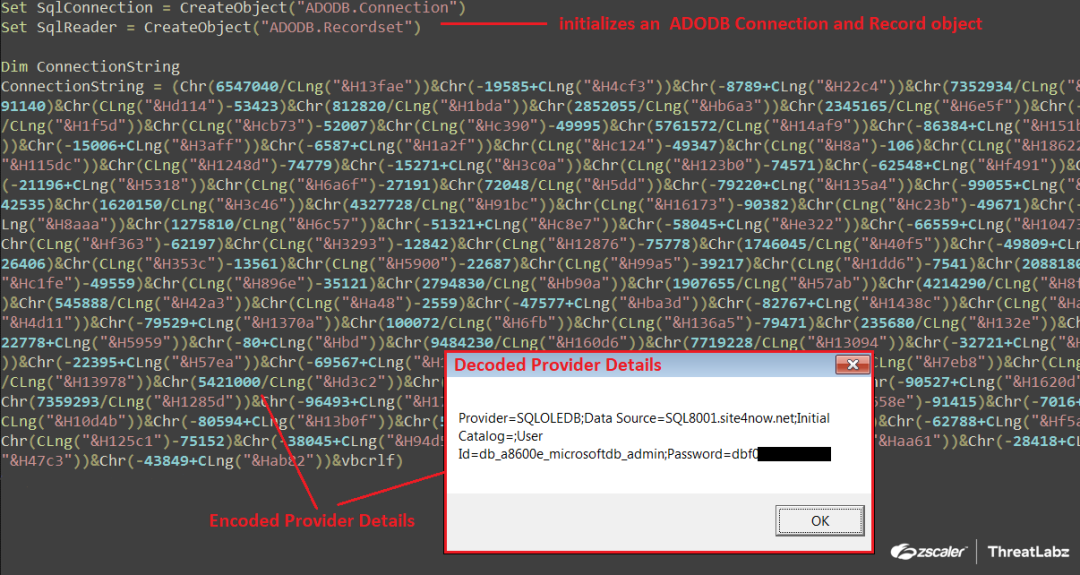 When the Stage-1 VBScript is executed, it establishes a connection to a database by creating an ADODB connection and record object. The details of the provider, including the data source, user ID, and password, are decrypted using an encoding method that utilizes the Chr and CLng functions, as illustrated in the screenshot below.