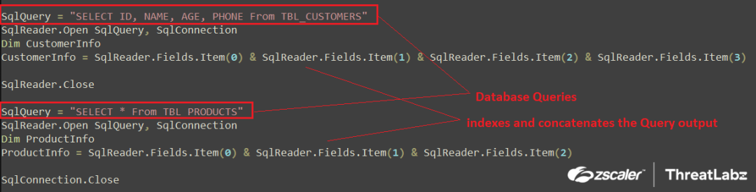 The results of these queries are then processed using "SqlReader.Fields.Item[index_val]" to extract the values from each column, and the values are concatenated together as shown in the screenshot below.