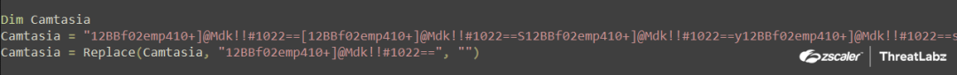 Following this, the script proceeds to decode a Downloader PowerShell script by replacing the string "12BBf02emp410+]@Mdk!!#1022==" with a null value. The decoded script is then saved into a variable named "Camtasia," as shown below.