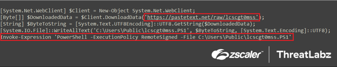 After executing the decoded downloader PowerShell script, the Stage-2 PowerShell script is downloaded from https[:]pastetext.net/raw/lcscgt0mss using $Client.DownloadData in byte format. The script is then converted to string format using UTF8.GetString() and written to the disk at C:\Users\Public\lcscgt0mss.ps1. The downloaded Stage-2 PowerShell script is then executed using Invoke-Expression, with the execution policy set as RemoteSigned. This allows the PowerShell interpreter to run unsigned scripts from the local computer.