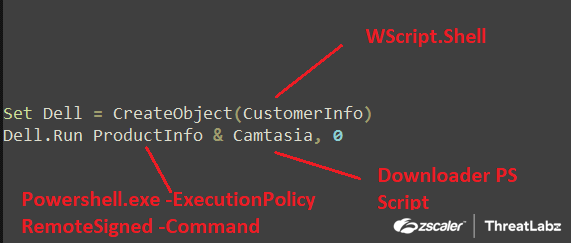 The decoded PowerShell script is saved in the "Camtasia" variable and executed together with the parsed database query response from the server. This creates a WScript.shell object, which then runs the concatenated command "Powershell.exe -ExecutionPolicy RemoteSigned -Command 'Decoded PowerShell Script'."